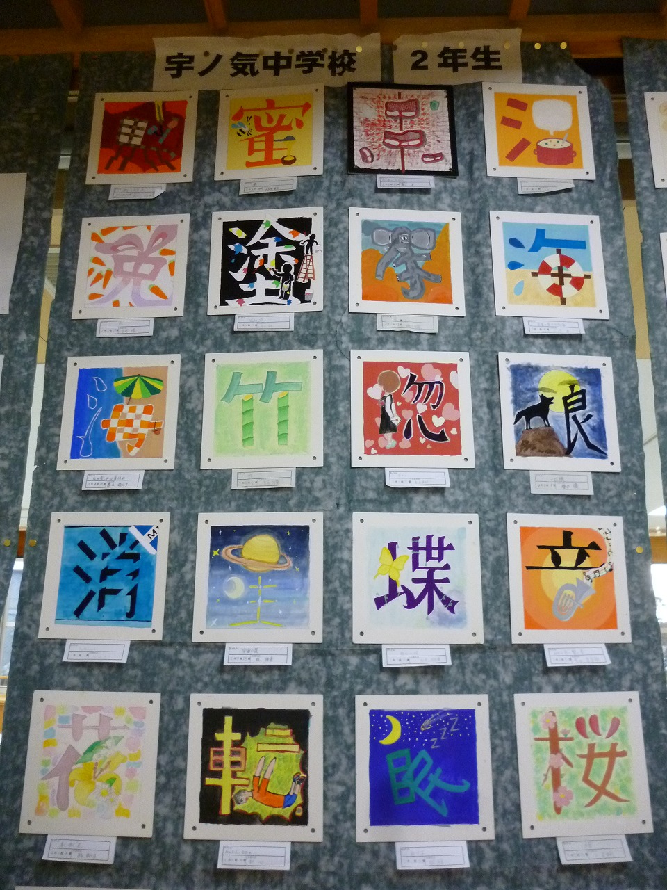 1年掲示板に美術作品「レタリングと漢字デザイン」を掲示しました。 この課題は毎年行っていますが、漢字デザインでは、いつもユニークなアイディアとデザインの作品が多いです。 今年も、おもしろい作品がたくさんありました。 &n1806 中2美術遊びの絵文字 1806 中2の美術では今年も 「遊びの絵文字」の課題に取り組みました。 その作品の一部が希望館2階廊下に 展示されていました。 漢字一字を選んで、 その漢字のイメージを絵で表し、 漢字と絵が一体となった絵文字をつくります。中1です。美術で、文字のデザインをやります。 そこで、描きやすい字、ありますか? 漢字一文字で、 ・画数が少なすぎす、多すぎず ・マイナスなイメージの漢字にしない ・文字と絵のバランスは64くらい なんですけど、、。